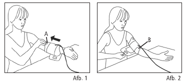Uitsparing B (zie afb. 2) van de manchet, tegenover het lipje, moet in de elleboogholte liggen. De slang moet midden op de elleboogholte liggen en in de richting van de hand wijzen.