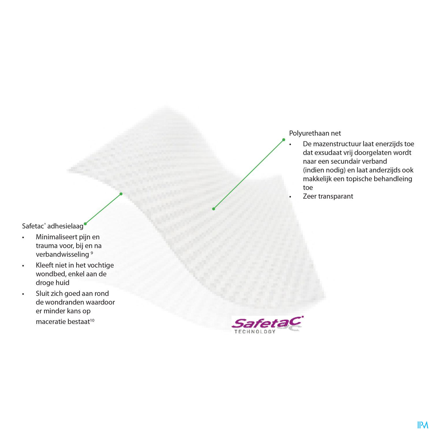 kleeft niet in het vochtige wondbed, enkel aan de droge huid