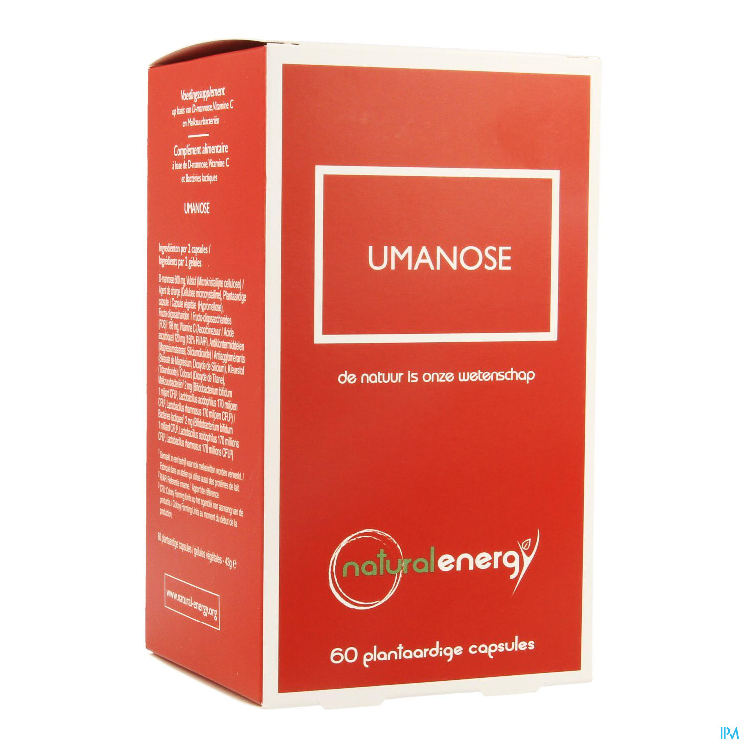 D-mannose is een suiker-isomeer van glucose, menselijk organisme worden gemetaboliseerd, de nier, menselijke, en ook aanwezig in sommige fruit zoals veenbessen (Cranberries). De e. coli hechten zich aan de huidige D-Mannose in veenbessen en worden geëlimineerd wanneer urineren. D-mannose is een lichaamseigen suiker, in de nier gemetaboliseerd, die ook gevonden wordt in fruit en bepaalde bessen zoals Cranberry's (veenbessen). De E. coli hechten zich aan de D-Mannose in de veenbessen en worden geëlimineerd bij het urineren. Colibacillen hechten zich op de D. Mannose van de Cranberry's. Umanose bevat ook pre- en probiotica die een bewezen actie hebben op de darmflora.Vitamine C is nuttig voor het gezond houden van de slijmvliezen.