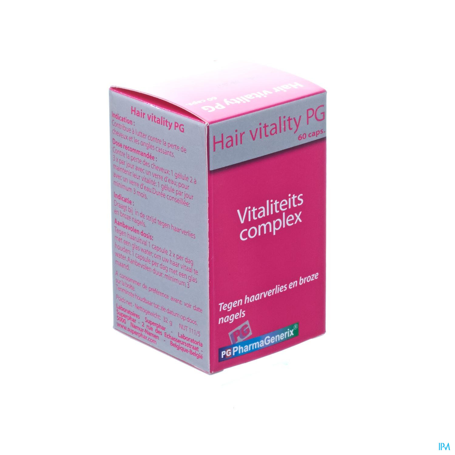 Je kan 'Hair Vitality Pg Pharmagenerix Caps 60' van het merk 'Pharmagenerix' bestellen in België bij PixelPharma via de volgende categorie: