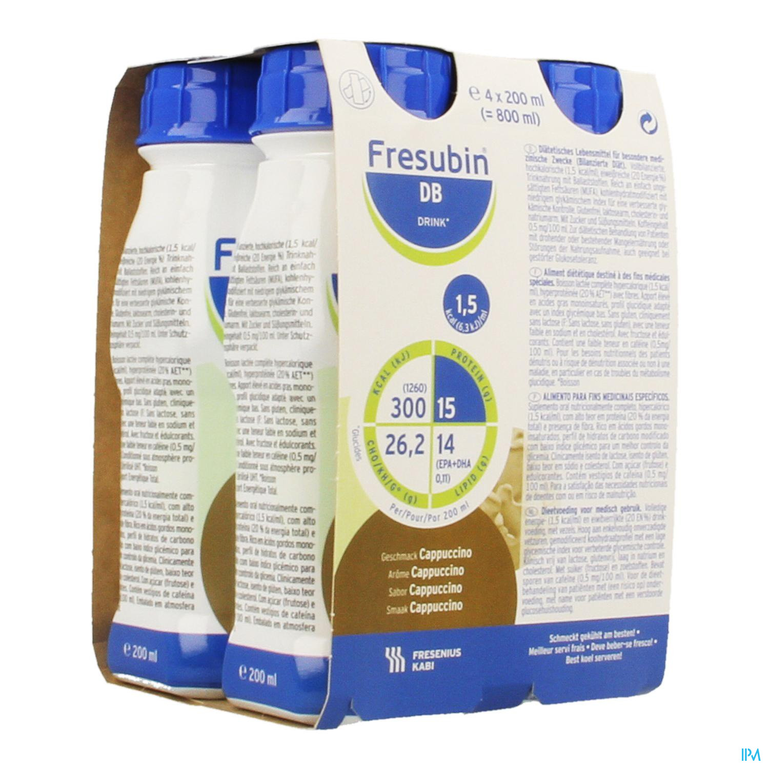 Je kan 'Fresubin Db Drink Cappuccino Easybot.4x200ml' van het merk 'Fresubin' bestellen in België bij PixelPharma via de volgende categorie:
